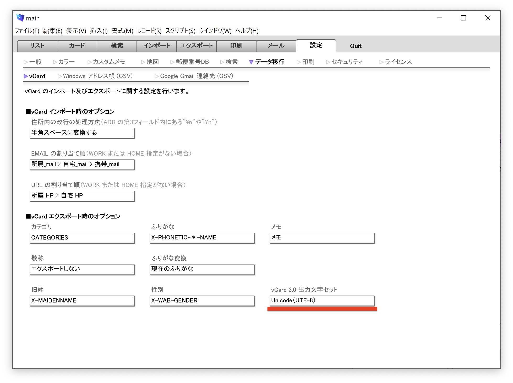 PowerAddress 5.0(Win アプリ版、Mac アプリ版、FileMaker 版)を起動し、移行したいデータを検索機能などを使って抽出します。すべてを移行したい場合は [全て表示] をクリックします。移行したいデータが決まったら、PowerAddress の設定> データ移行> vCard 画面を開き、vCard のエクスポート設定を確認します。vCard 3.0 出力文字セットが、「Unicode(UTF-8)」になっていることを確認してください。