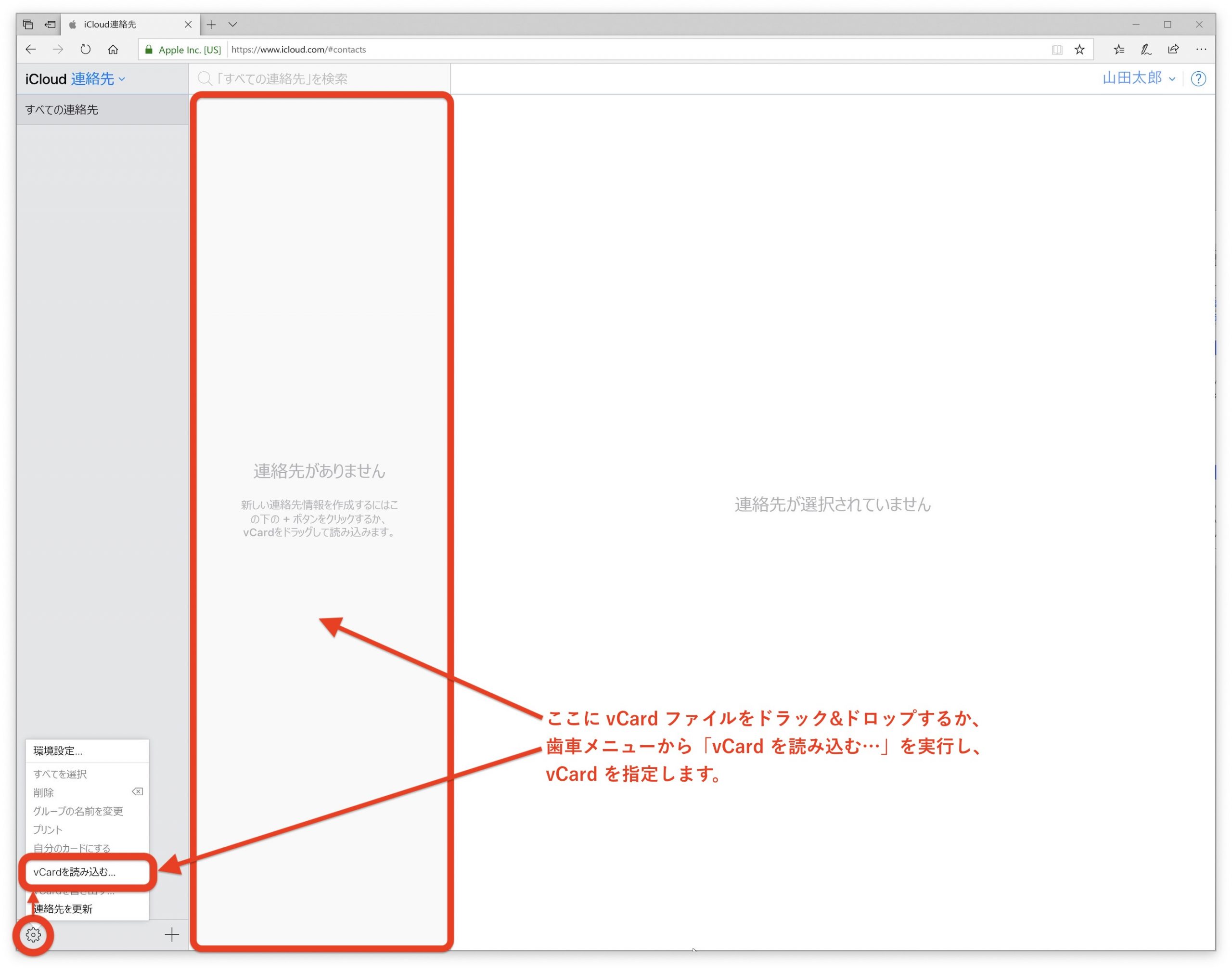 iCloud にログインし、下図の大きな赤枠の部分に vCard ファイルをドラック&ドロップするか、iCloud 連絡先の歯車メニューから「vCard 読み込み…」を実行し、vCard ファイルを指定してインポートします。